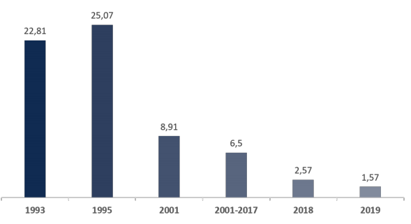 Em 1995, um ano após o Plano Real, a inflação foi de 22,41% e o CDI foi de 53,09%. Uma derrubada impressionante tanto na inflação como no juro nominal, mas o juro real ainda seguiu alto (25,07%). Apenas em 2001, o juro real ficou abaixo de 10%, encerrando o ano em 8,91%. Entre 2001 e 2017, o juro real foi, em média, de 6,5% ao ano. Um padrão alto que justificava ter o CDI como referência de rentabilidade para os investimentos em renda fixa.