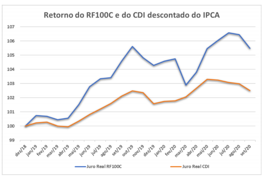 Os juros reais do RF100C e do CDI, em termos anualizados no período de dezembro de 2018 a setembro de 2020, é de 3,10% ao ano e 1,42% ao ano, respectivamente. Ou seja, o RF100C apresentou um juro real mais que o dobro do CDI no período. É importante observar que o RF100, ao longo de 21 meses, apresentou por 6 meses uma performance abaixo do CDI e 3 meses de rentabilidade negativa. Ainda assim, apresentou juros real muito superior ao CDI. Na prática, não devemos olhar rentabilidades no curto prazo.